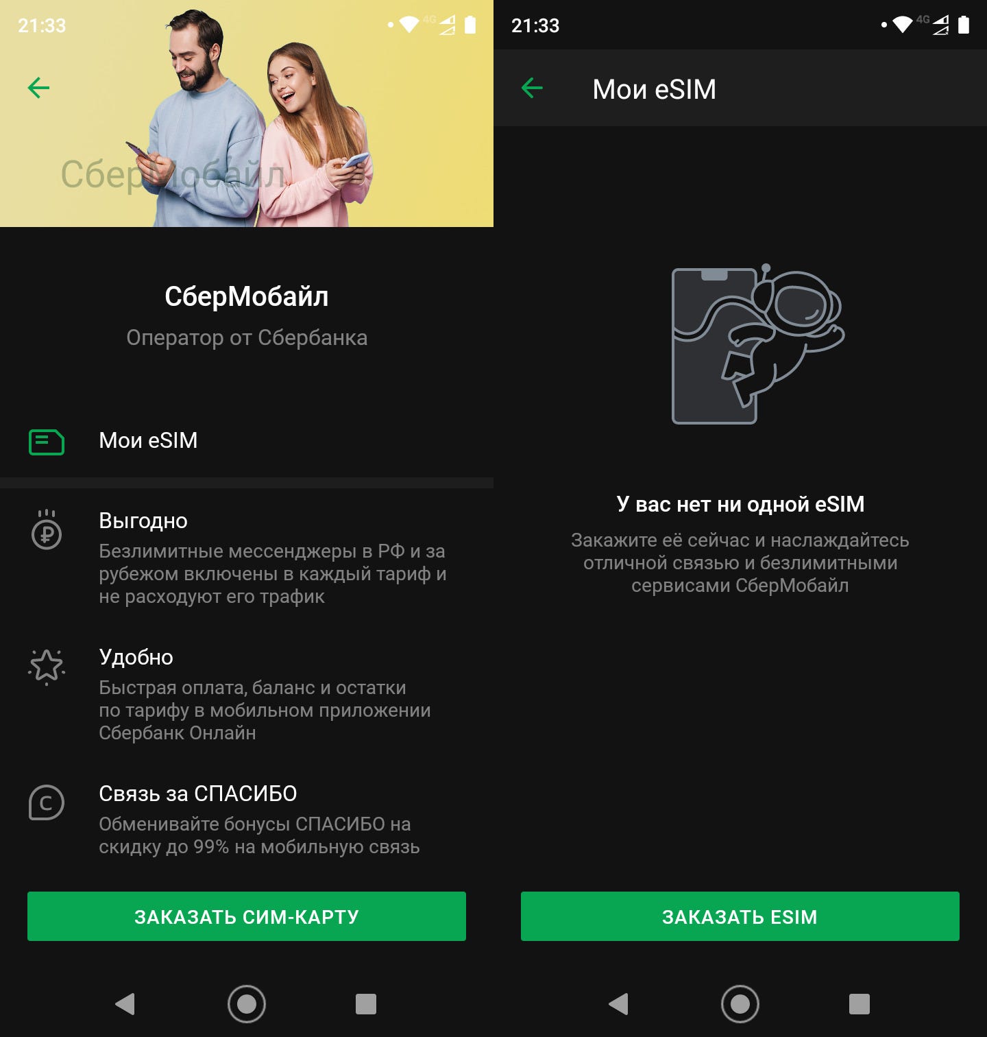 При заказе eSim приложение проверяет поддержку технологии устройством пользователя. В случае успеха подключение происходит полностью дистанционно: клиент банка может активировать eSim без явки в офис и предъявления паспорта. Идентификация абонента происходит через учётную запись “Сбер ID” пользователей продуктов банка.